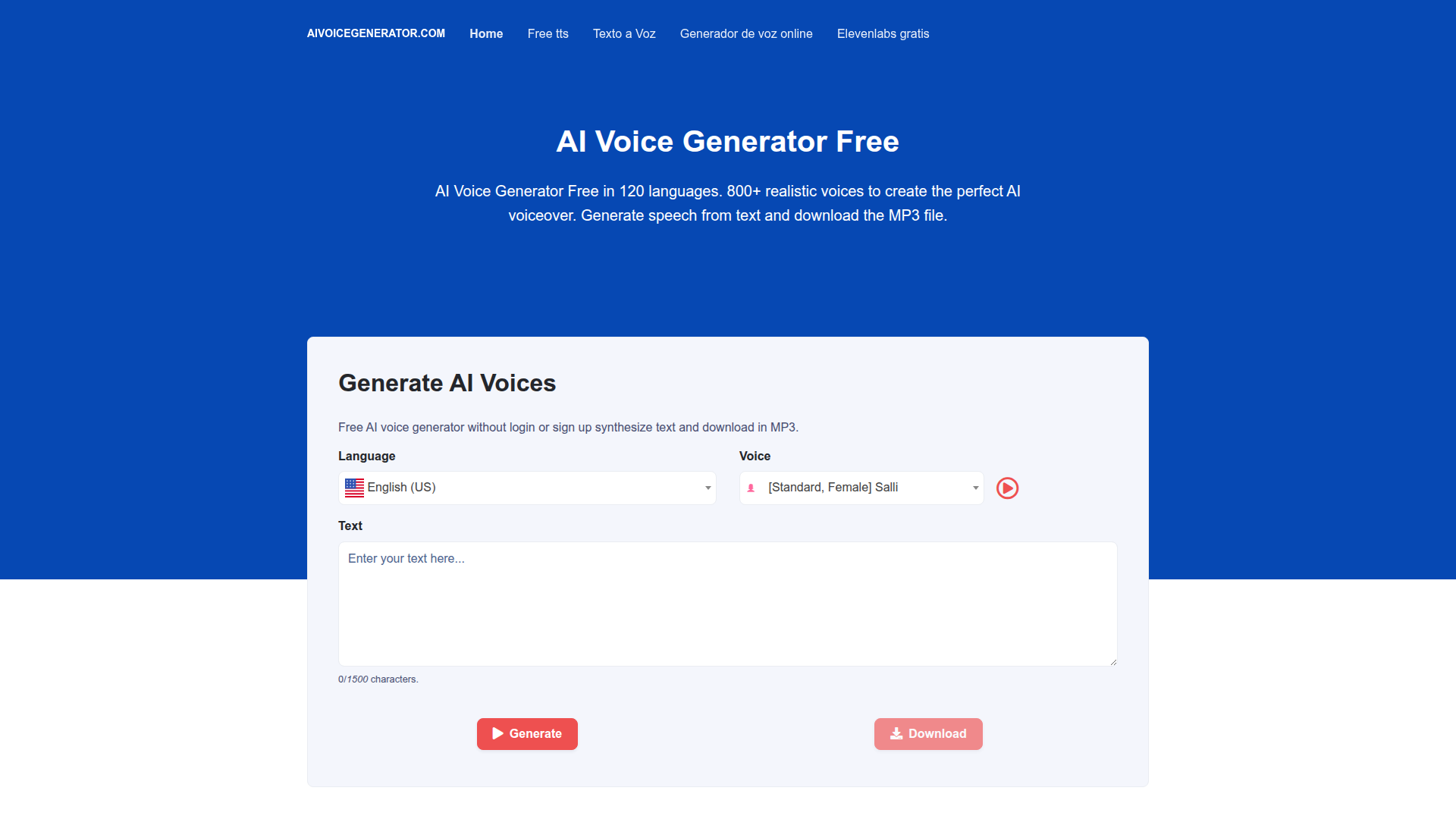 AI Voice Generator Free in 120 languages. 800+ realistic voices to create the perfect AI voiceover. Generate speech from text and download the MP3 file.