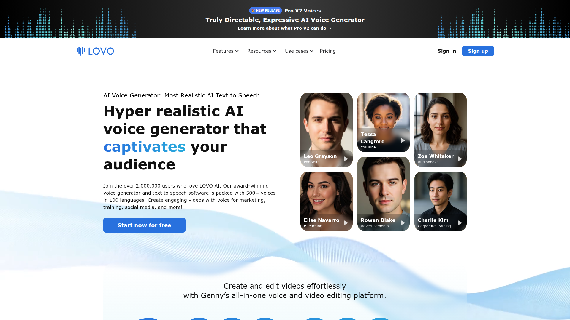 Have you ever struggled to find the right voice for your projects? Look no further! LOVO's AI Voice Generator is your ultimate solution. With over 500 hyper-realistic voices in 100 languages, you can create captivating audio for videos, podcasts, e-learning, and much more in just a few clicks! Imagine effortlessly transforming your scripts into engaging content that truly resonates with your audience. Whether you're a marketer, educator, or content creator, LOVO makes it easy to add a professional touch to your work. Join over 2 million satisfied users today and start your journey for free. Don't miss out on the chance to elevate your projects—explore LOVO now!